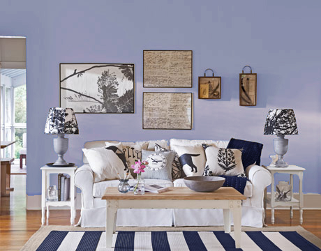 Ve světle modré barvě působí prostor příjemným přímořským dojmem. Stačilo by přidat několik velkých mušlí a hvězdic nebo korálů a z obýváku je najednou oáza odpočinku se svěžím vánkem a šuměním moře.