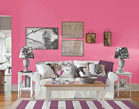 Výrazná růžová barva na stěnách asi není pro každého. I když konkrétně tomuto obýváku docela sluší. Dává mu nasládlý a moderní vzhled.