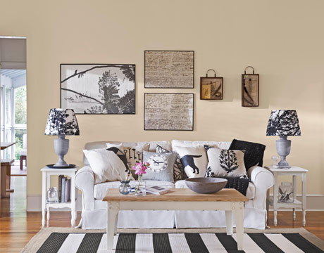 Jemný světle béžový odstín dělá z místnosti skutečně decentní místo zařízené tón v tónu. Přírodní odstíny doplňují tmavé doplňky.