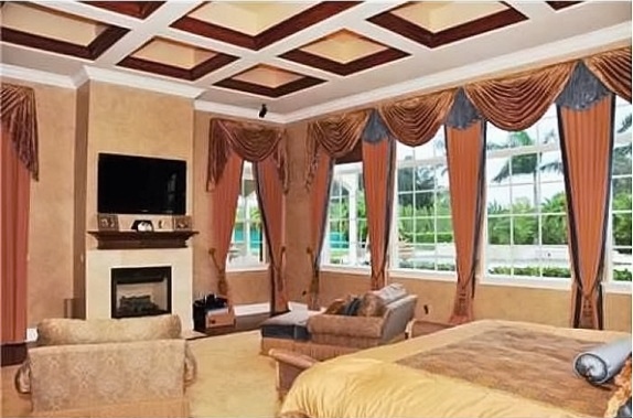 Velice prostorná ložnice je luxusně zařízená s prostornou postelí, honosnými závěsy, krbem a nástěnnou televizí. Celá ložnice působí tak trochu pompézně, což jí ubírá na kráse. Skromnější zařízení by ji udělalo domáčtější a útulnější.