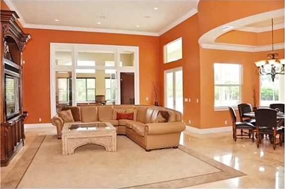 Z letní kuchyně se plynule přechází do jednoho z obývacích pokojů. Ten je prostorný a poměrně jednoduše zařízený. Jednolitá příjemná barva na stěnách dává místnosti čistý dojem. Mohutná kožená sedačka a masivní skříň jsou hlavními robustními dominantami místnosti.