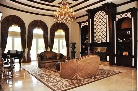 Druhý obývací pokoj je pak zařízený kontrastně bílou barvou na stěnách a tmavým nábytkem a doplňky, což působí celkem těžkopádně. Tím spíš, že má místnost vysoký strop, ke kterému se tyčí tmavá vysoký krbová římsa s postranními policovými knihovnami a těžké tmavé závěsy.