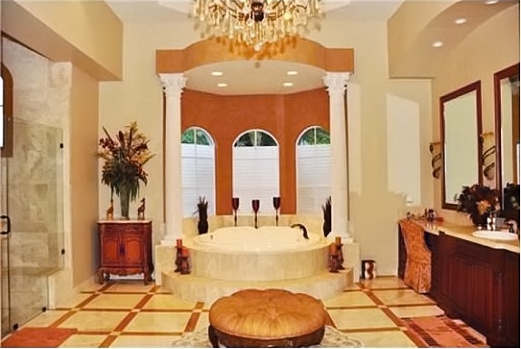 Honosně pak působí také koupelna, u které je sympatický koncept zabudované velké vany v podlaze, u které jsou velká okna. Jinak je ovšem koupelna zase poněkud pompézní.