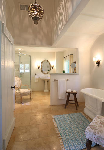 K interiéru pak snad ani nejde nic dodat. Venkovsky jednoduché, útulné i přes rozsáhlé rozměry místností. Koupelna v čistém bílém designu kombinuje luxusní starožitné vybavené se stylovou účelností. Lustr s perforovaným stínítkem, které dává nádherné pohádkové stíny je třešničkou na dortu.