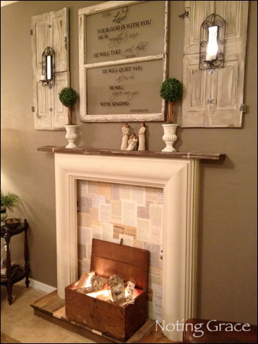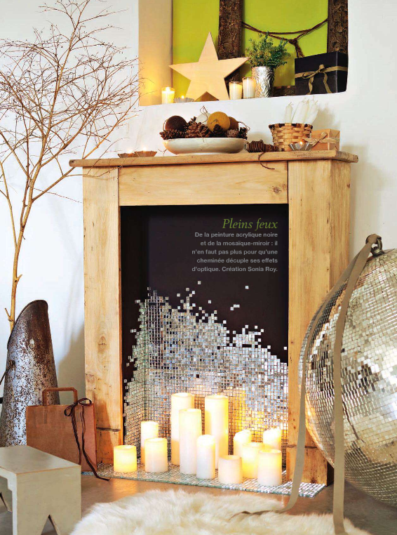 Velice zajímavě pak vypadá také použití vánočních světýlek na elektřinu, které je možné buď ve falešné krbové římse naaranžovat třeba do podoby jako na spodním obrázku, kdy jsou použita polena, kolem kterých jsou světýlka omotaná, aby vytvářela dojem klasického krbu. Druhou velmi pěknou variantou, kterou jsme viděli, bylo pouhé zavěšení světýlek jako závěsu po celém prostoru umělé krbové římsy.