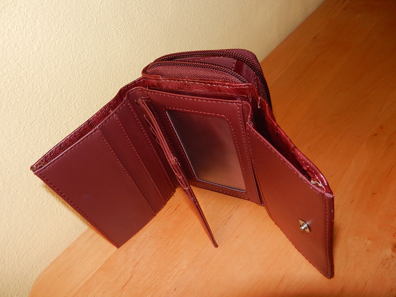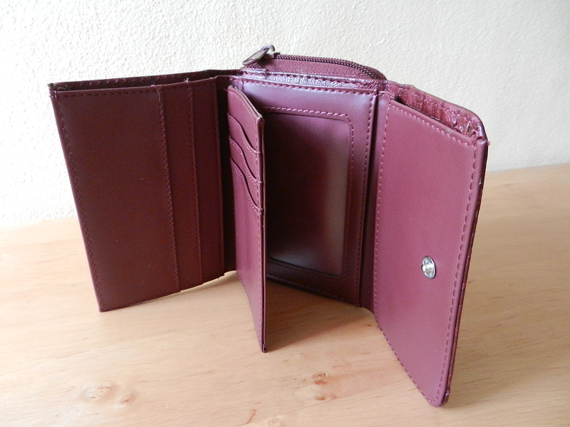 Peněženka je rozdělená na dvě části. Z jedné strany je na zip dvojitá přihrádka na mince. Z druhé strany je na cvoček prostorná část na papírové bankovky, 6 přihrádek na karty, 2 průhledné přihrádky na fotky a jedna boční přihrádka.