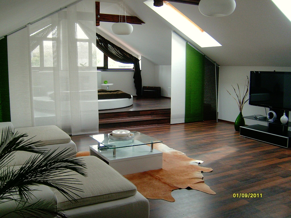 Krásný světlý a hlavně vzdušný prostor elegantně rozdělený na obytnou a spací část posuvnými stěnami. Žádné výstřelky a všechno decentně sladěné. Moc pěkný a vkusně zařízený prostor. Líbí se nám a proto získal 1. místo. Gratulujeme!